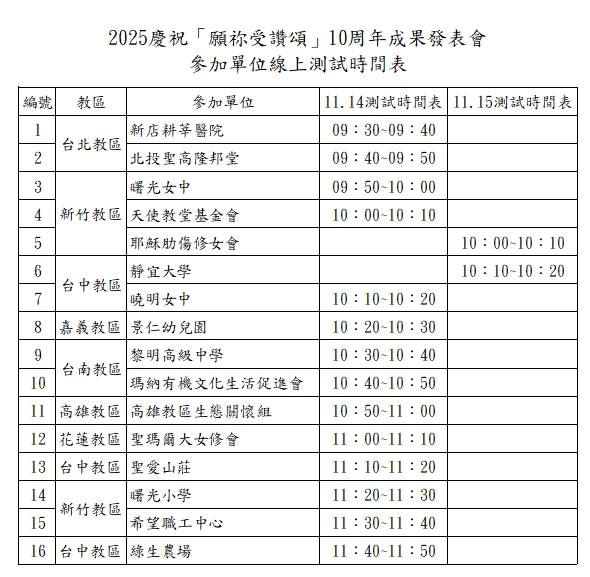 | 2025 年 10 月 01 日 | o 正式公告發表會辦理辦法,發函各教區。 o 開始建置官方網頁與報名系統。 |