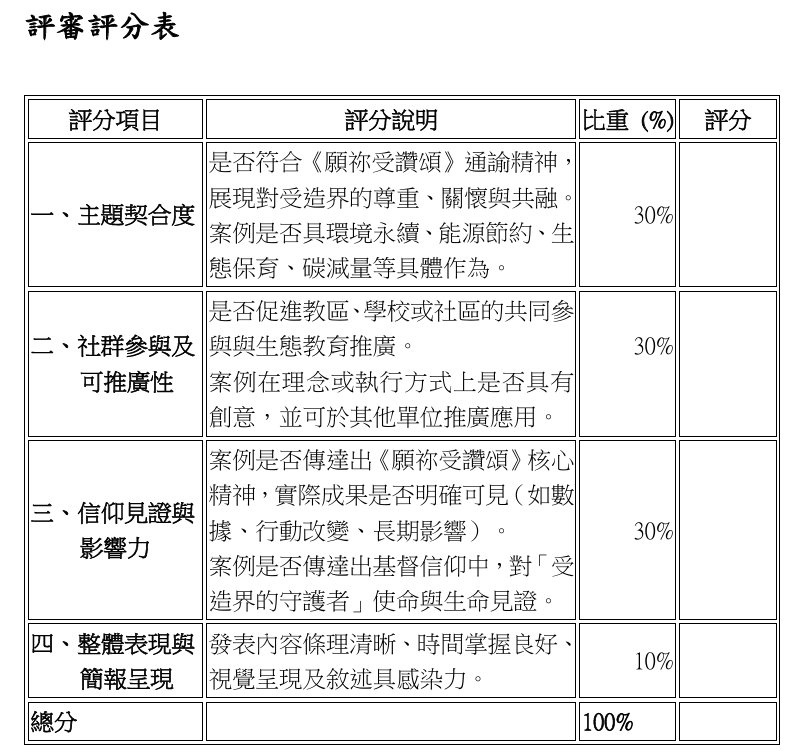 | 10 月 01 日 | 10 月 31 日 | o 各教區提供聯絡窗口作為執行顧問,並推薦 2–3 個優秀成果參與成果發表會(回傳報名表單)。 o 籌組評審團,確認評審規則及評選流程。 |