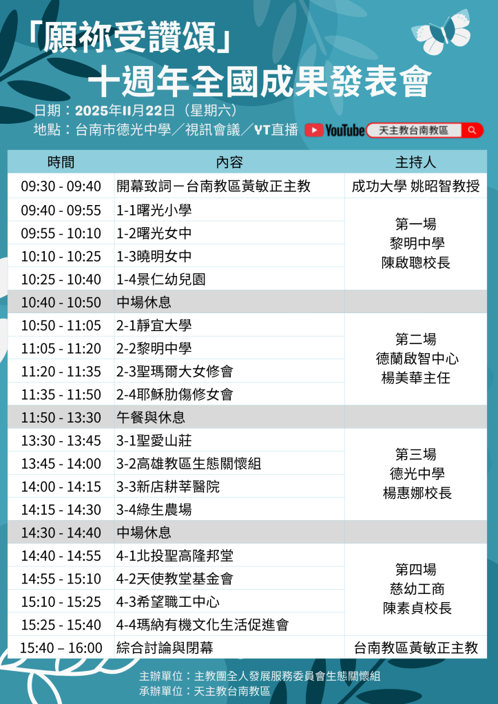 00:00 線上發表會開始、長官致詞…【第一階段報告】17:52曙光小學 32:37曙光女中 50:02曉明女中 1:07:45景仁幼兒園 【第二階段報告】1:30:48靜宜大學 1:46:28黎明高中 2:01:42聖瑪爾大女修會 2:15:36耶穌肋傷修女會 【第三階段報告】4:07:43聖愛山莊 4:23:01瑪納有機文化生活促進會 4:40:08耕莘醫院 4:58:11綠生農場 【第四階段報告】5:26:05聖高隆邦堂 5:45:07天使教堂 6:01:22希望職工中心 6:15:59高雄教區生態關懷組