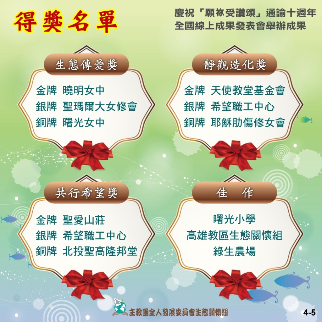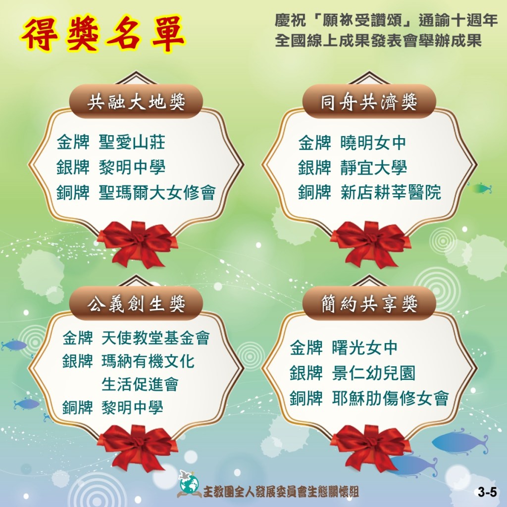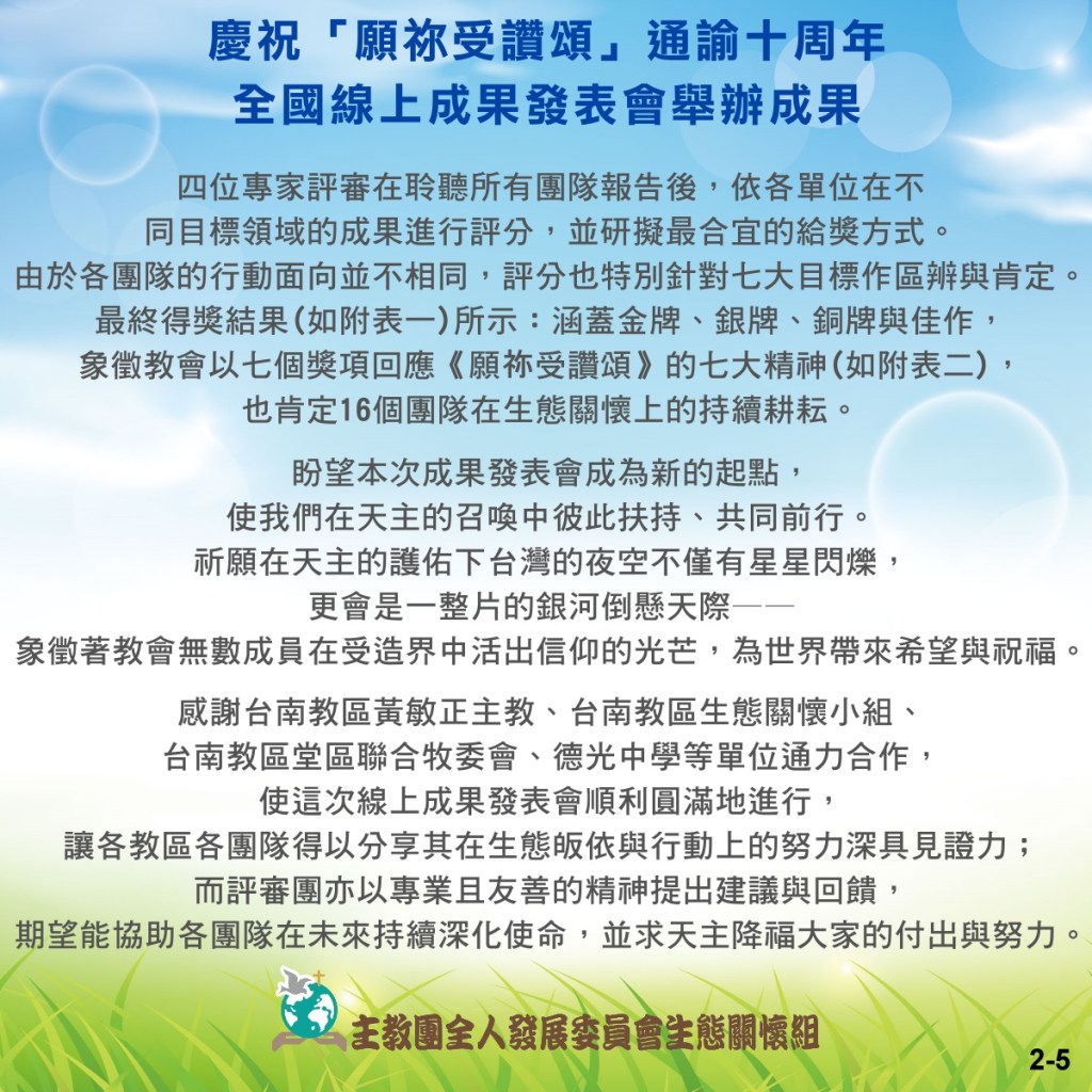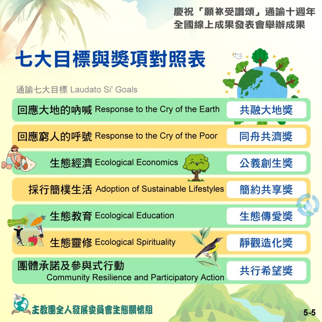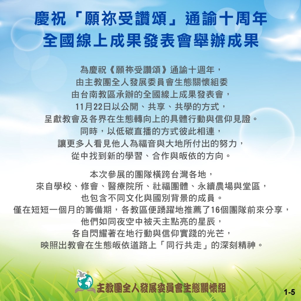 為慶祝通諭十週年,全人發展委員會生態關懷組責成台南教區主辦「全國線上成果發表會」,俾利收集優良案例擴大學習分享。本活動將以低碳的線上發表會方式舉行,促進全台教友與社會各界人士交流,並鼓勵全台持續推動環境生態保護。